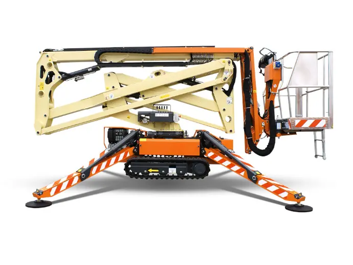 Temps d’installation réduit grâce aux stabilisateurs de mise à niveau automatique. Entraînement à chenilles, maniabilité facilitée dans des environnements sensibles et étroits. Légère et compacte pour un transport et un fonctionnement simplifiés dans des zones avec restriction de charge. Solution plus propre et silencieuse (si utilisation sur secteur).
